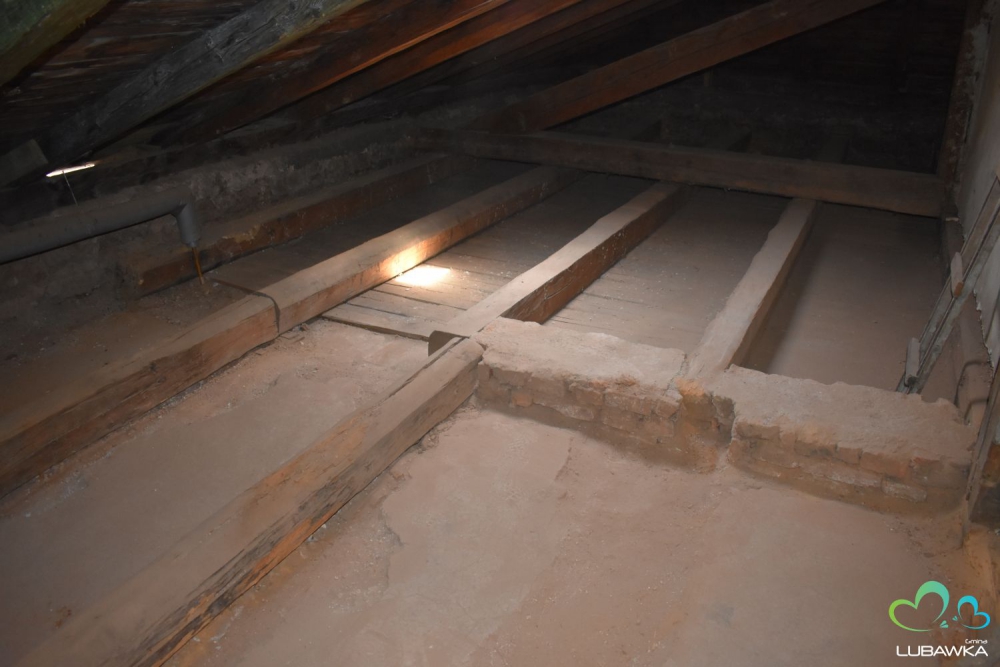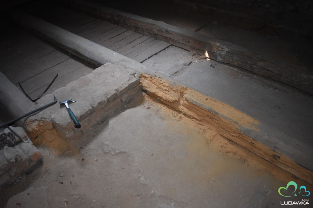 Po usunięciu polepy, desek z podłogi na strychu i wyniesieniu szlaki umieszczonej w stropie nad poddaszem odsłonił się pełen obraz konstrukcji drewnianej stropu oraz więźby dachowej w Ratuszu. W złym stanie są belki stropowe. W wielu przypadkach nie nadają się do dalszej eksploatacji. Do wymiany są również płatwie kalenicowe. Stan techniczny więźby wymaga dodatkowej konsultacji projektantów termomodernizacji Ratusza z Inspektorem nadzoru co do zakresu oraz sposobu prac zabezpieczających bądź wymiany elementów. Po zdjęciu boazerii z pomieszczenia na parterze odsłoniły się ściany. Okazało się, że są w dobrym stanie. Nie ma zbyt dużego zawilgocenia jak wcześniej przypuszczano.