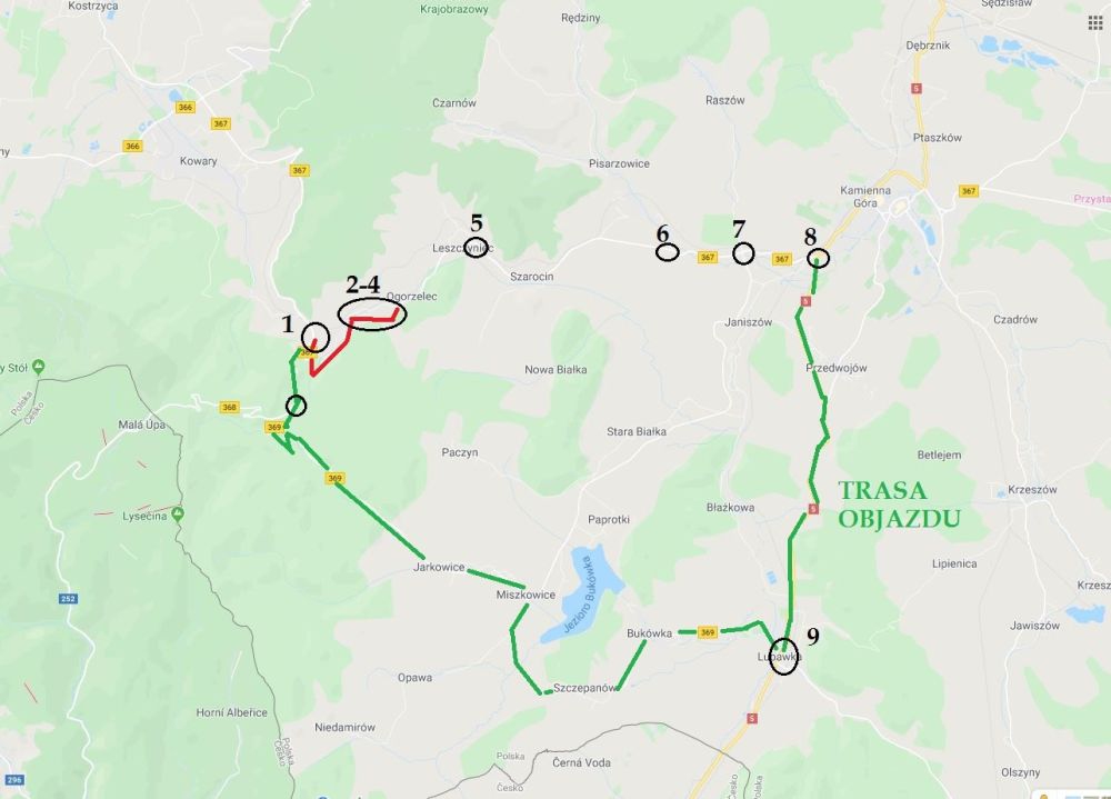 Alternatywą jest objazd na odcinku Kamienna Góra - Kowary przez miejscowości: Janiszów, Stara Białka, Miszkowice, Jarkowice.