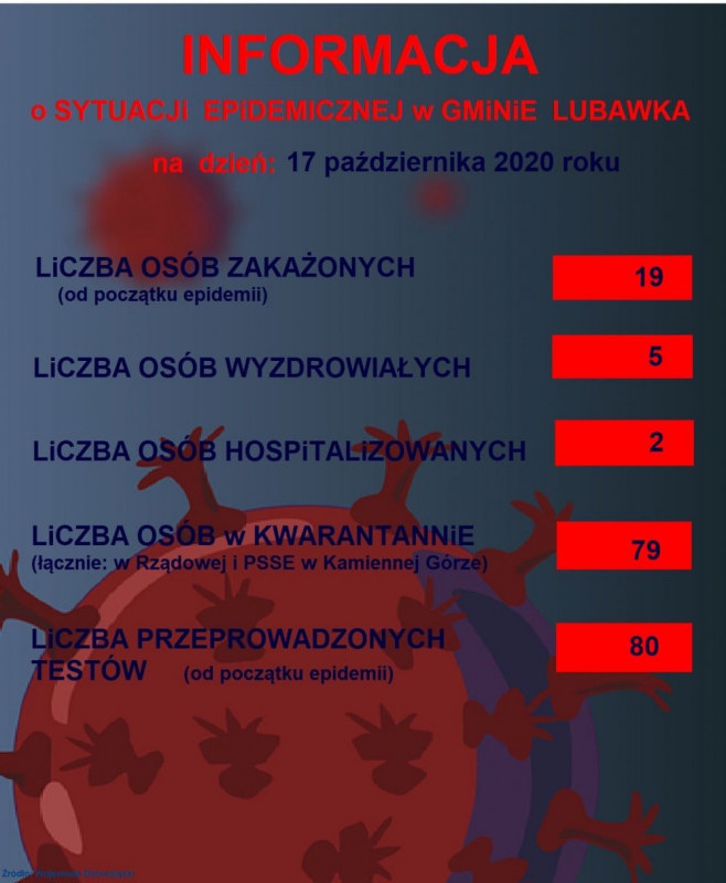 Od dzisiaj, 17.10.2020 r. wznawiamy informacje o stanie epidemicznym w Gminie Lubawka Przedstawiamy informacje o stanie epidemicznym w Gminie Lubawka na dzień 17 października 2020 r. Galeria zdjęć Marlena Popławska Organizacyjny Data wydarzenia: 2020-10-17 Stworzony: 2020-10-17 20:55 Edytowany: 2020-10-17 21:11