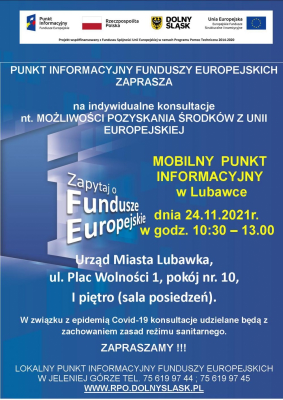 W ramach Mobilnego Punktu Informacyjnego pracownik Punktu Informacyjnego Funduszy Europejskich w Jeleniej Górze będzie pełnić dyżur w siedzibie Urzędu Miasta Lubawka, ul. Plac Wolności 1, pokój nr. 10, I piętro (sala posiedzeń).