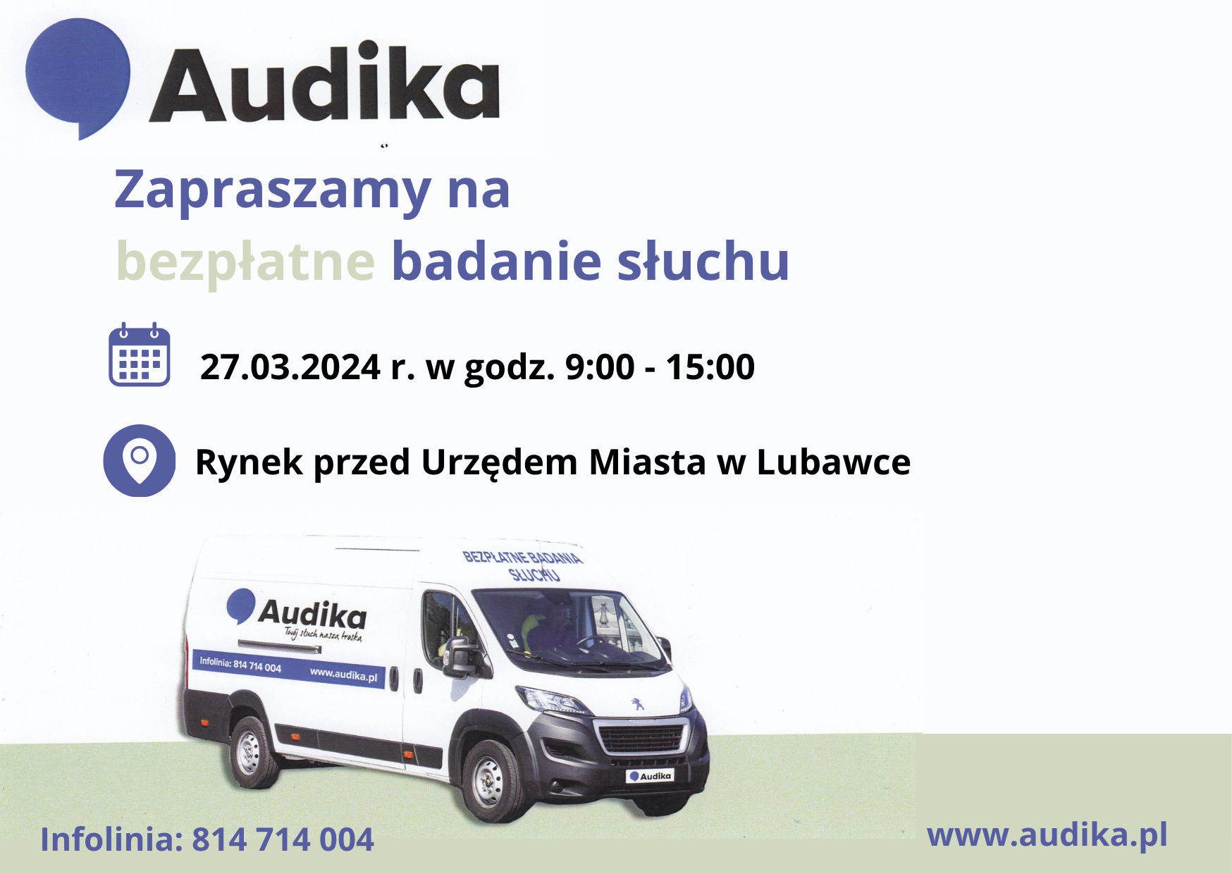 Zapraszamy mieszkańców gminy Lubawka do skorzystania z bezpłatnego badania słuchu, które odbędzie się 27 marca 2024 r. w godz. od 9:00 do 15:00 w Lubawce przed Urzędem Miasta.