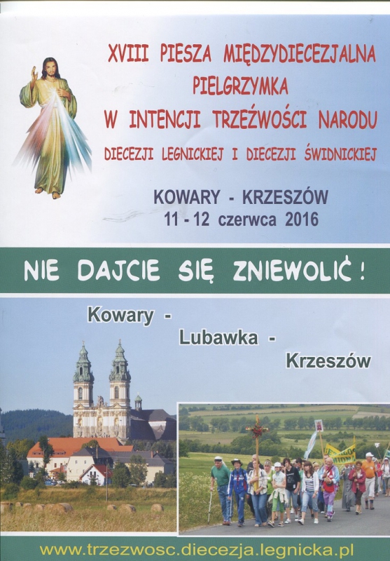 W dniach 11- 12 czerwca 2016 roku odbędzie się XVIII Piesza Międzydiecezjalna Pielgrzymka w Intencji Trzeźwości Narodu: Diecezji Legnickiej i Diecezji Świdnickiej na trasie Kowary - Lubawka - Krzeszów pod hasłem "Nie dajcie się zniewolić"
