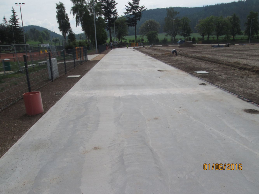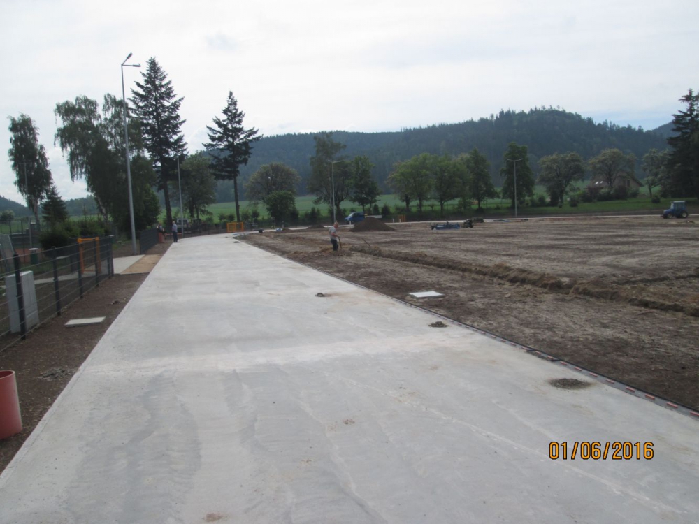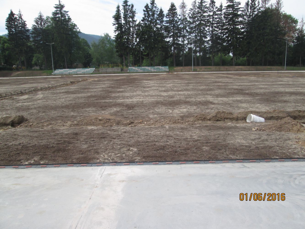 Została wykonana wylewka betonowa na bieżni lekkoatletycznej oraz na zakolu. Obecnie na wykończeniu są prace związane z montażem instalacji nawadniającej płytę boiska.