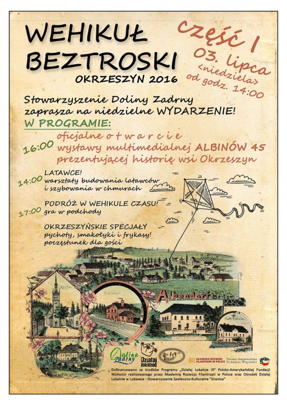 Wehikuł Beztroski - Okrzeszyn 2016 to projekt realizowany przez Stowarzyszenie Doliny Zadrny w ramach programu Działaj Lokalnie.