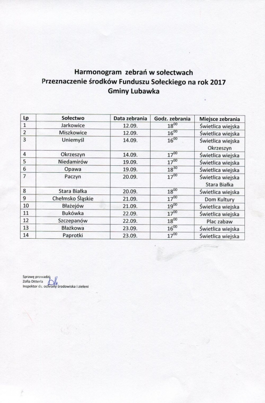 Harmonogram zebrań w sołectwach Poniżej znajdą Państwo harmonogram zebrań w sołectwach dot. przeznaczenia środków Funduszu Sołeckiego na rok 2017 Gminy Lubawka. Galeria zdjęć Daria Powązka OELiUSC Data wydarzenia: 2016-09-14 Stworzony: 2016-09-14 10:45 Edytowany: 2016-09-14 10:49