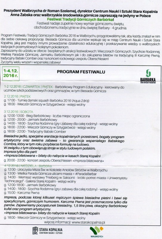 Prezydent Wałbrzycha dr Roman Szełemej, dyrektor Centrum Nauki i Sztuki Stara Kopalnia Anna Żabska oraz wałbrzyskie środowiska górnicze zapraszają na jedyny w Polsce Festiwal Tradycji Górniczych Barbórka! W ofercie znaleźć można wiele bezpłatnych atrakcji festiwalowych m.in.: Wieczór Górniczy, Szychtę Rodzinną, Wielką Paradę Górniczą, Jarmark Barbórkowy, oraz koncert zespołu Oberschlesien!