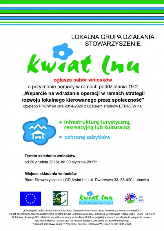 Lokalna Grupa Działania Stowarzyszenie "Kwiat Lnu" ogłasza nabór wniosków o przyznanie pomocy w ramach podziałania 19.2 "Wsparcie na wdrażanie operacji w ramach strategii rozwoju lokalnego kierowanego przez społeczność" objętego PROW na lata 2014-2020 z udziałem środków EFRROW na: