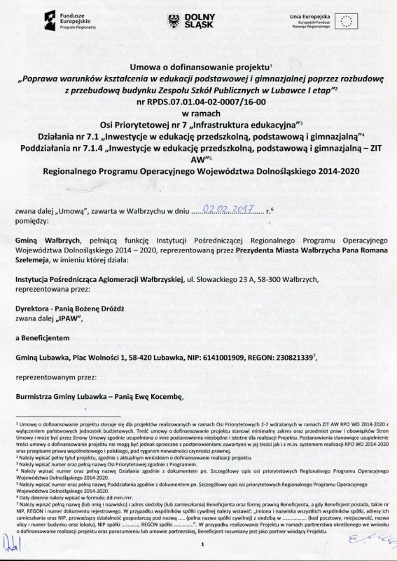 Wczoraj tj. 02.02. br w siedzibie Instytucji Pośredniczącej Aglomeracji Wałbrzyskiej odbyło się oficjalne podpisanie umowy o dofinansowanie projektu: Poprawa warunków kształcenia w edukacji podstawowej i gimnazjalnej poprzez rozbudowę z przebudową budynku Zespołu Szkół Publicznych w Lubawce Etap I