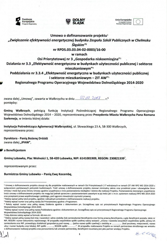 Jeżeli chodzi o umowę dofinansowania projektu: " Zwiększenie efektywności energetycznej budynku Zespołu Szkół Publicznych w Chełmsku Śląskim, głównym celem projektu jest zwiększenie efektywności energetycznej budynków użyteczności publicznej w Gminie Lubawka. W celach szczegółowych znaleźć możemy m.in. wspieranie przejścia na gospodarkę niskoemisyjną w sektorze publicznym na terenie Gminy Lubawka i obniżenie globalnej emisyjności obiektów publicznych w Gminie Lubawka, poprzez zmniejszenie emisji CO2 budynku ZSP w Chełmsku Śląskim, poprawa jakości powietrza w Gminie Lubawka poprzez obniżenie emisji CO2 pyłów zawieszonych PM10, zwiększenie efektywności energetycznej sektora publicznego poprzez termomodernizację ZSP w Chełmsku Śląskim, wykorzystanie odnawialnych źródeł energii w infrastrukturze publicznej poprzez montaż kotłów na biomasę.