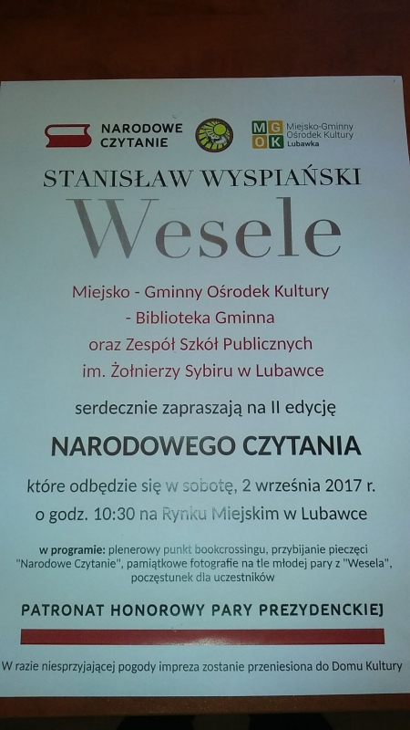 W sobotę 2 września o godz. 10.30 na Rynku Miejskim w Lubawce rozpoczynamy Narodowe Czytanie 2017.