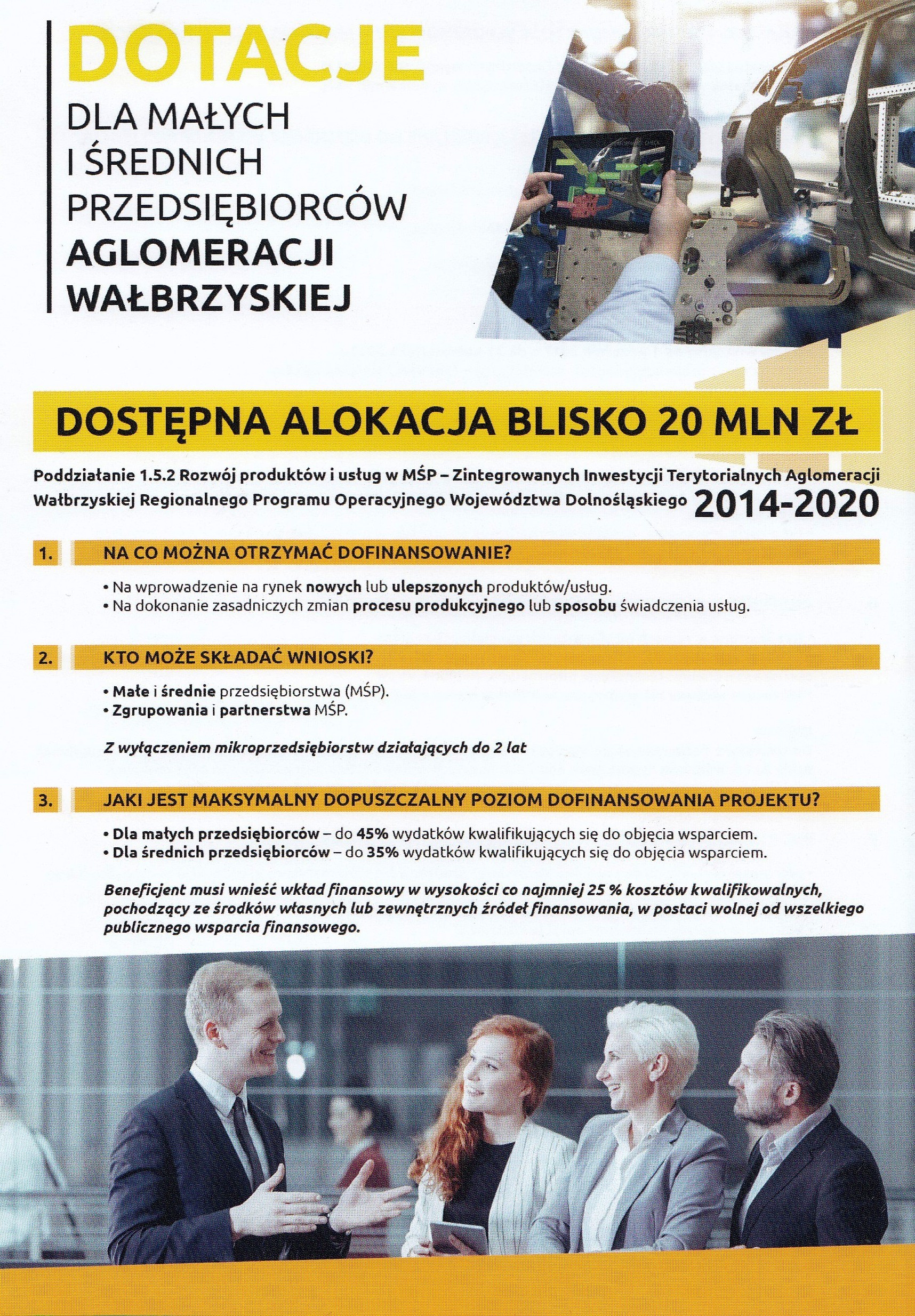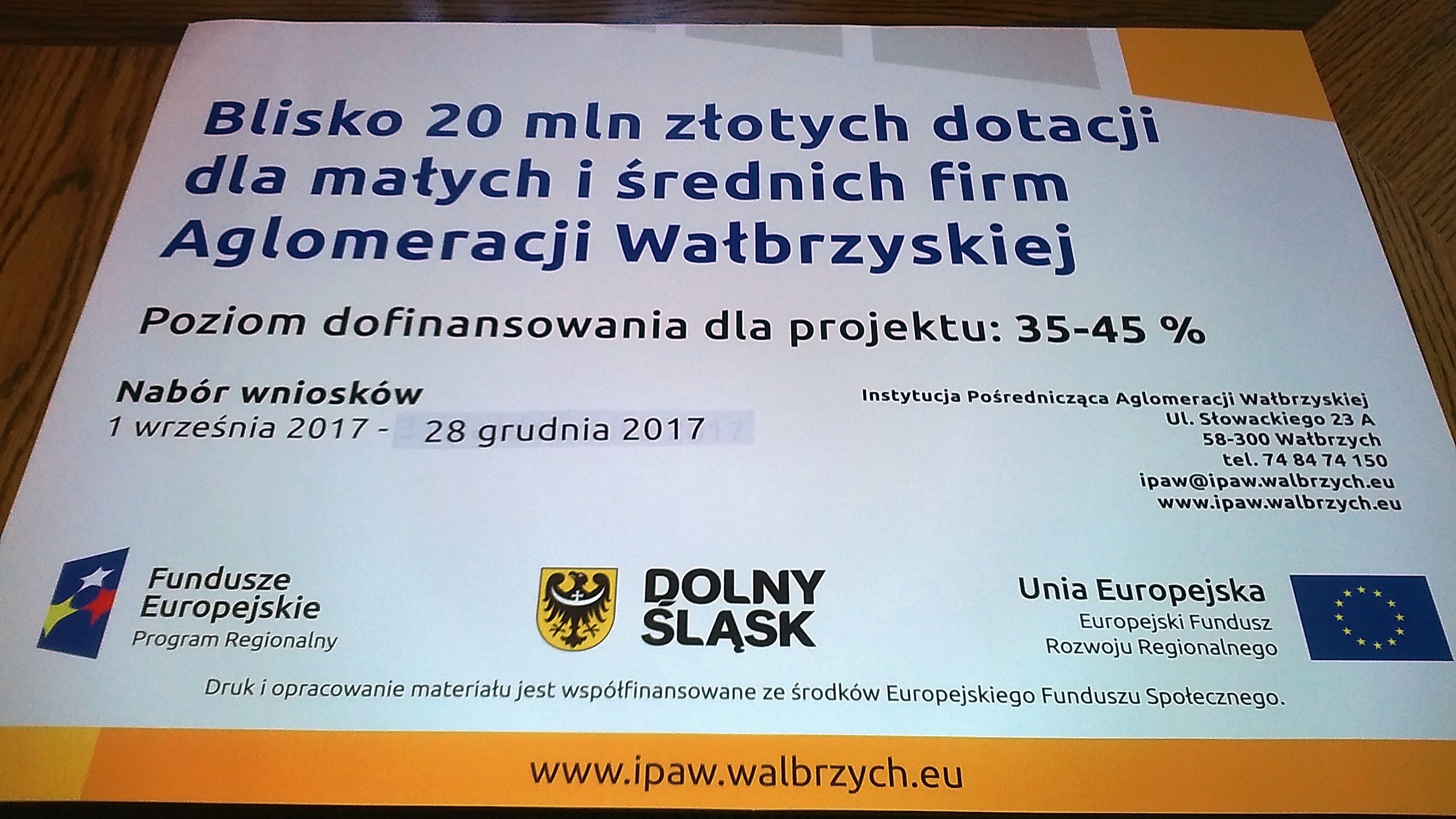20 mln złotych dotacji dla małych i śrdenich firm Aglomeracji Wałbrzyskiej Blisko 20 mln złotych dotacji dla małych i średnich firm Aglomeracji Wałbrzyskiej. Więcej informacji uzyskają Państwo na załączonym plakacie i ulotce. Pliki do pobrania Plakat Ulotka 1 Ulotka 2 Bartek Ryszkowski OELiUSC Data wydarzenia: 2017-10-19 Stworzony: 2017-10-19 13:29 Edytowany: 2017-10-19 15:03