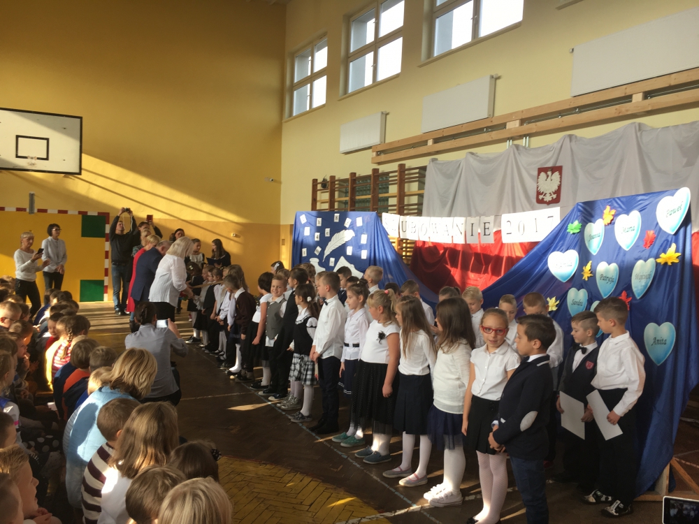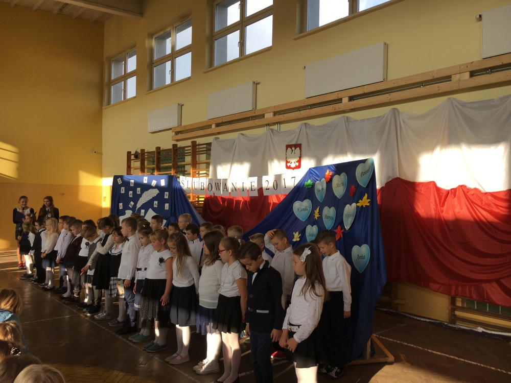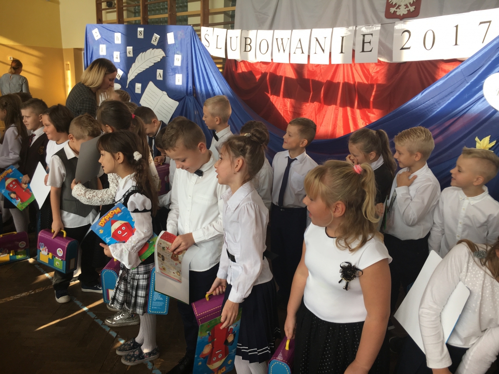 Uroczystość ślubowania odbyła się 12 października 2017 roku w sali gimnastycznej. W tej doniosłej chwili obecna była Dyrekcja Szkoły, pani Burmistrz Miasta Lubawka Ewa Kocemba, rodzice i dziadkowie uczniów oraz zaproszeni goście. Pierwszoklasiści zaprezentowali w ramach egzaminu krótki program artystyczny, w którym przedstawili wierszyki dotyczące naszej ojczyzny, szkolnej nauki czy zasadach wychowania. Egzamin zdali celująco! Uczniowie zostali obdarowani pamiątkowymi dyplomami, drobnymi upominkami oraz słodkim poczęstunkiem.