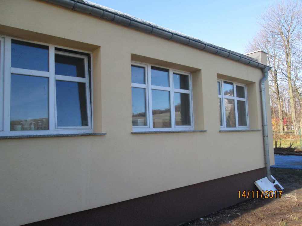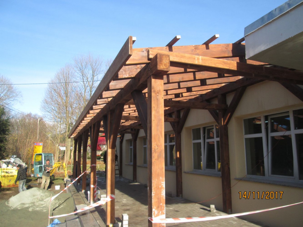 Wylano taras przy głównym wejściu do świetlicy, nad którym montowane jest przekrycie z bezbarwnych płyt poliwęglanowych. Obecnie układana jest kostka na pochylni dla osób niepełnosprawnych oraz płyty granitowe przy głównym wejściu do budynku.