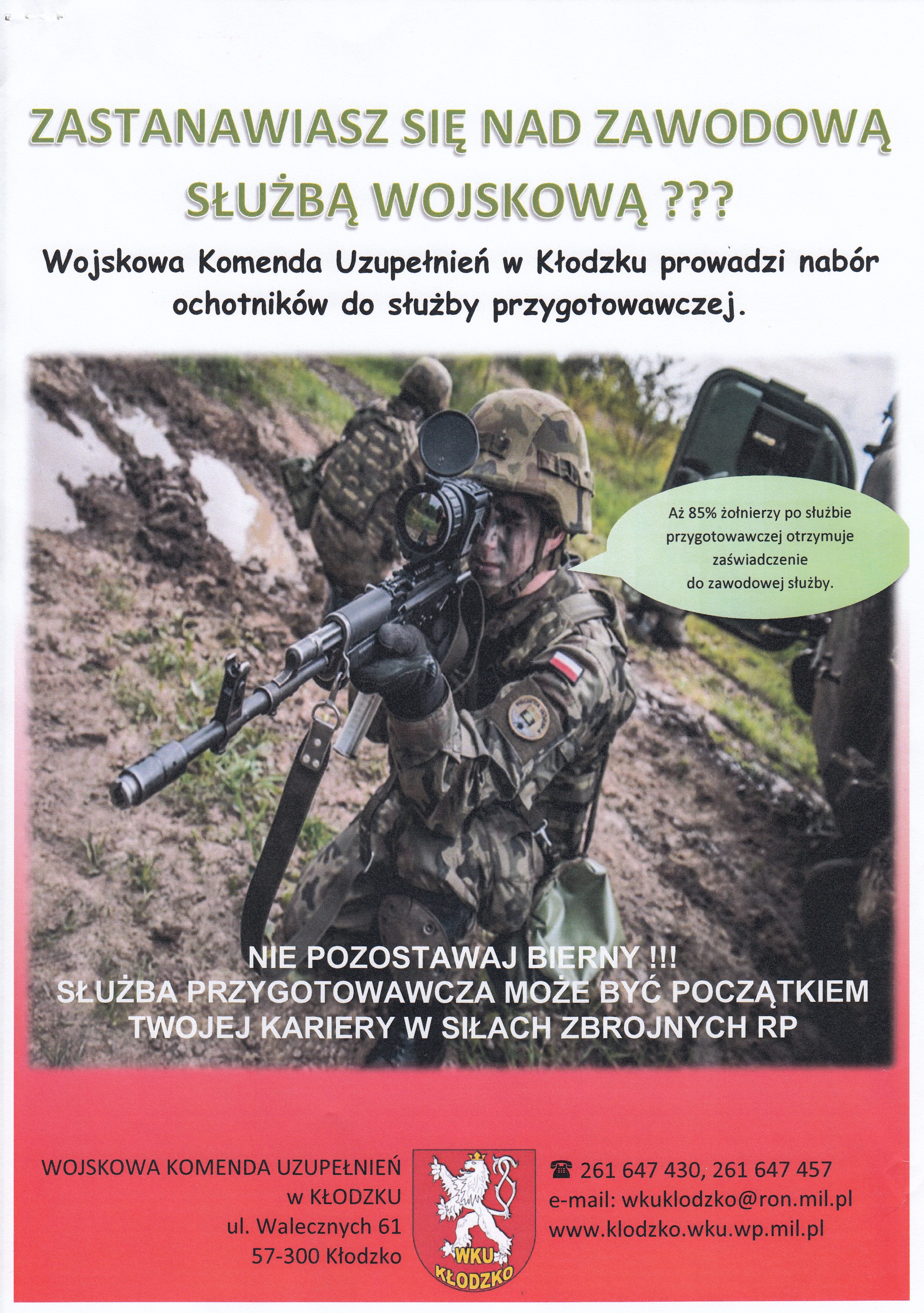 Wojskowa Komenda Uzupełnień w Kłodzku prowadzi nabór do służby przygotowawczej z przeznaczeniem do korpusu szeregowych, na II turnus w 2018 r. w terminie od 7 maja do 31 sierpnia 2018 r.