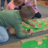 Dzieci z grupy MUMINKI malowały plakaty. Każdy zespół dostał szablon drzewa na dużym arkuszu i malował farbami. Trudnym zadaniem było naklejanie owoców na plakat zgodnie z napisanymi nazwami drzew.