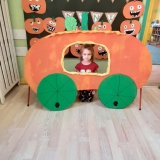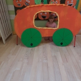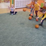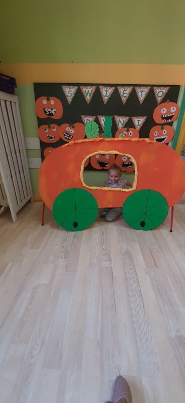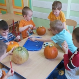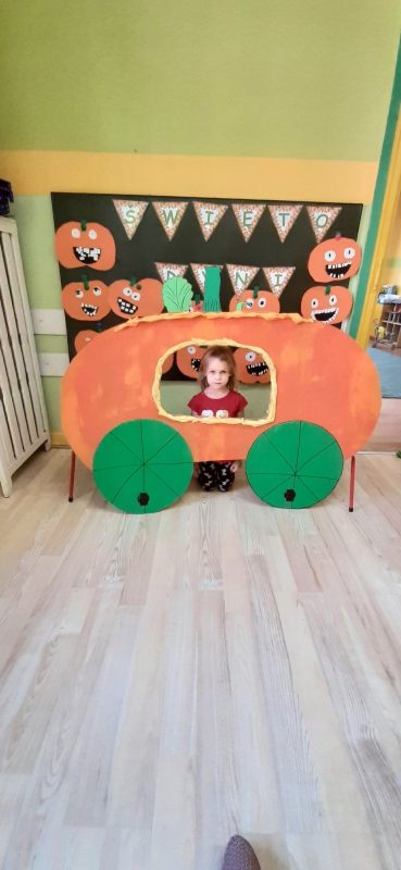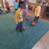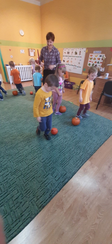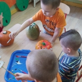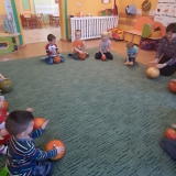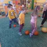 W piątek 29 pażdziernika obchodziliśmy w grupie BIEDRONKI Dzień Dyni. Ten dzień wypełnionym był licznymi zabawami. Były zabawy ruchowe: slalom z dynią pomiędzy pachołkami, toczenie dyni w tunelu, podawanie górą i dołem, dyniowe kręgle, zabawa muzyczna "Parząca dynia", układaliśmy dynie według wzrastającej wielkości, malowaliśmy dynie farbami. Przekroiliśmy jedną dynię i obejrzeliśmy jej wnętrze. Smakowaliśmy pysznych prażonych pestek dyni. Nie zabrakło zdjęć w dyniowej fotobudce.