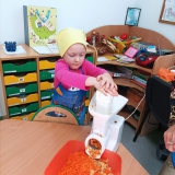 W trakcie omawiania tematu przewodniego "Jesień w sadzie", "Tygryski" samodzielnie wykonały surówkę z marchewki i jabłka.