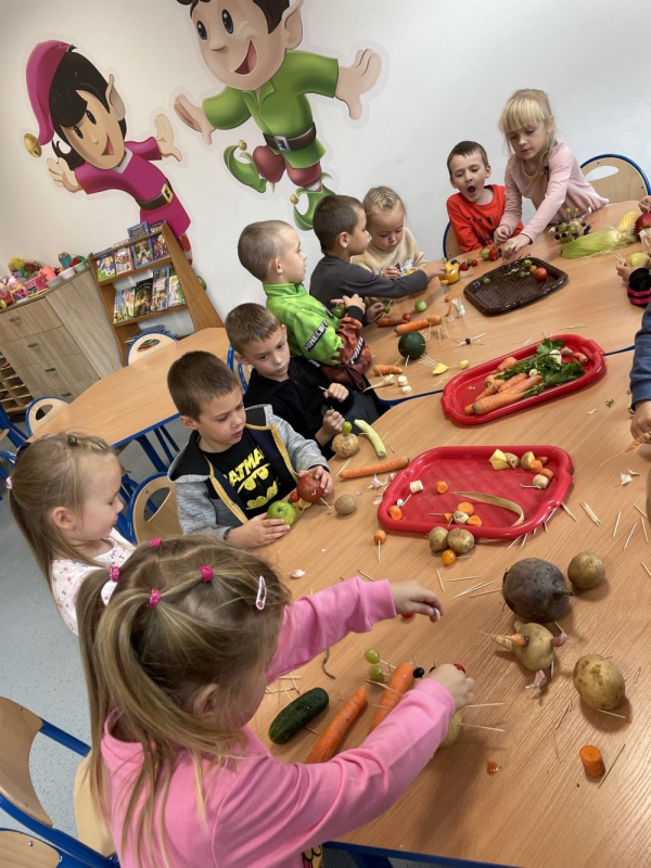 Jesień jest porą roku, która inspiruje do wykorzystywania jej darów nie tylko w sposób praktyczny, ale też uruchamia wyobraźnię i pozwala tworzyć różne artystyczne dzieła. Przedszkolaki z grupy SKRZATY wykazały się swoją pomysłowością i inwencją twórczą podczas robienia ludzików z warzyw. Dzieci przyniosły do przedszkola warzywa, z których wyczarowały niesamowite warzywne stworki. Przedszkolaki mogły się przekonać, że warzywa i owoce to nie tylko pyszne i zdrowe danie ale również dużo świetnej zabawy