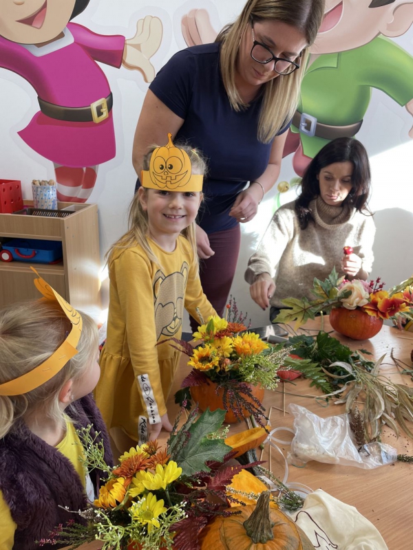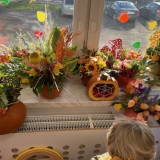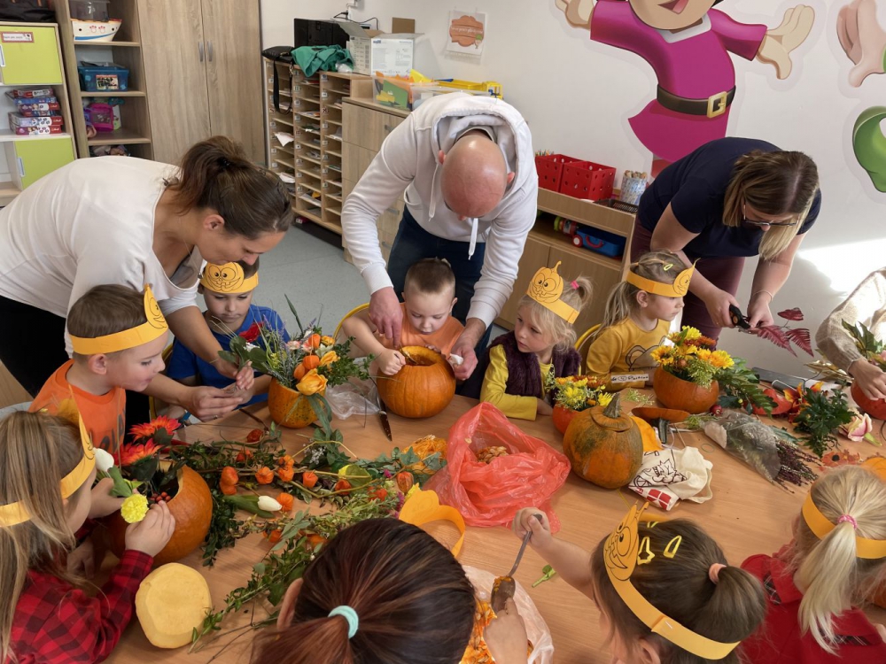 Nadchodzi koniec jesiennych zbiorów, więc to najlepszy czas by ogłosić "Dzień Dyni". Skrzaty poznały wielką różnorodność dyń i wzbogaciły wiedzę na ich temat. Dowiedziały się, że dynia jest bardzo zdrowym warzywem i, że można z niej przygotować wiele dań tj.: pieczywo, zupę, dżem, ciasto, babeczki, przetwory i soki. Dzieci miały okazję przekonać się jak smakuje deser dyniowy, które przygotowała dla nas jedna z mam. Następnie przystąpiliśmy do dyniowych zabaw: klasyfikowania dyń wg wielkości, koloru i kształtu. Wśród zabaw ruchowych były dyniowe kręgle, skoki przez różnej wielkości dynie, slalom dyniowy. Dzieci z zapałem zabrały się również do prac plastycznych, powstałe piękne prace.Ten dzień przyniósł wiele niezapomnianych wrażeń, ciekawości, odkrywania i zabawy co widać na zdjęciach