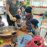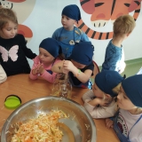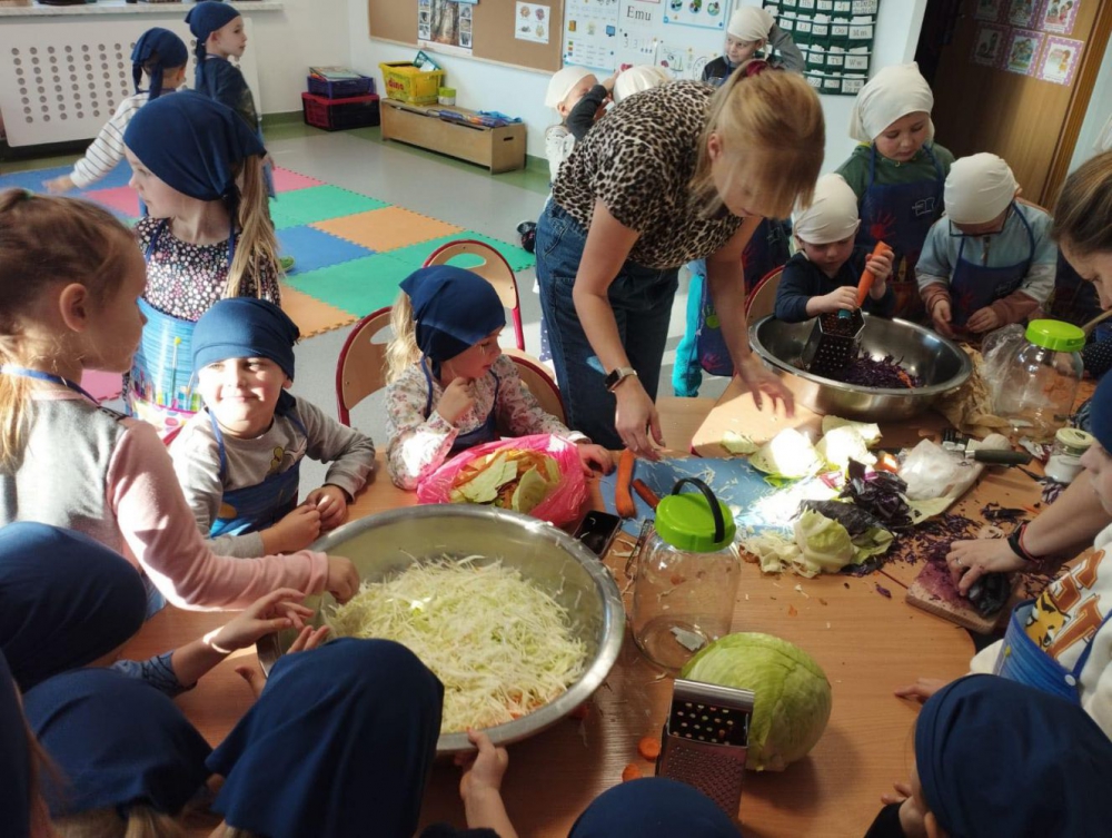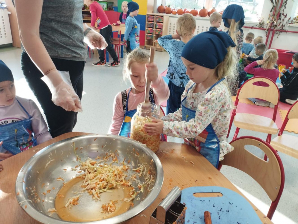Dzieci miały okazje poznać kapustę wszystkimi zmysłami (wzrok, smak, zapach, dotyk) i dowiedzieć się, jak dawniej przygotowywano zapasy na zimę. Czego potrzeba do zakiszenia kapusty? Przedszkolaki już to wiedzą. Dzieci przygotowały kapustę do kiszenia. Najpierw ją poszatkowały. Następnie poszatkowaną kapustę wrzuciły do przygotowanego w tym celu słoika i każdą warstwę posypywały solą. Należy wspomnieć, że nie zapominały o jej dokładnym ugnieceniu w słoiku tak, aż kapusta puściła sok. Dzieci wytrwale pracowały pod czujnym okiem swoich pań. Następnie słój z kapustą kiszoną został umieszony w kąciku przyrody, gdzie przedszkolaki będą mogły obserwować proces fermentacji.