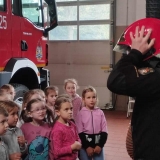 Panowie Strażacy pokazali pomieszczenia w których odbierane są zgłoszenia o pożarach lub wypadkach. Następnie zaprezentowali całe wyposażenie wozu strażackiego. Przedszkolaki wysłuchały opowieści o trudnej i niebezpiecznej pracy strażaków. Utrwaliły sobie numer telefonu do straży pożarnej 998 oraz numer alarmowy 112.