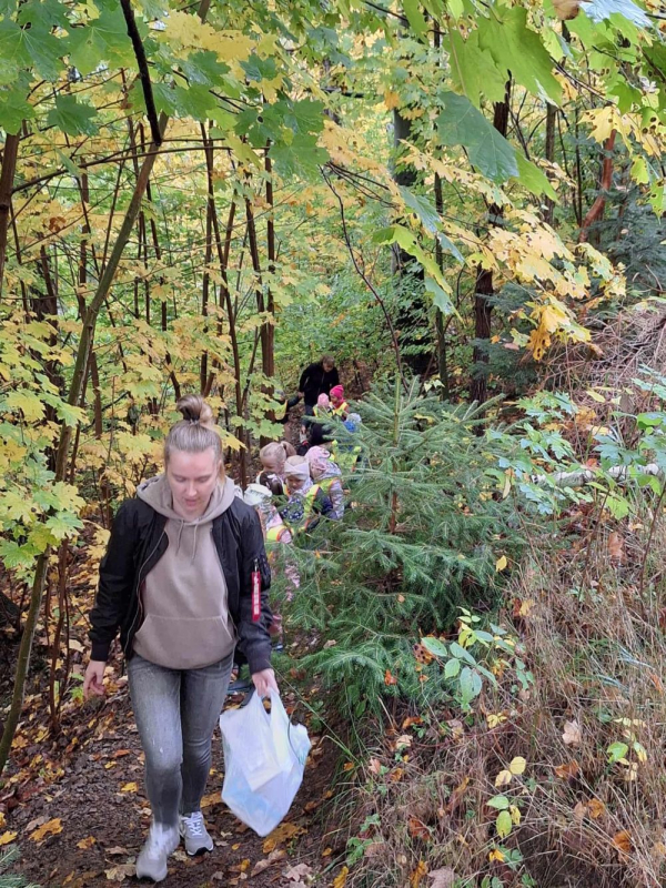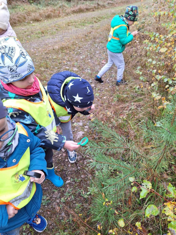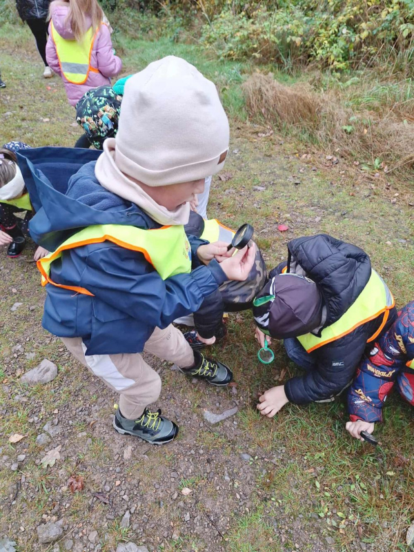 Podczas spaceru przedszkolaki miały okazję oglądać liście, korę drzew, mchy oraz owady przez szkła powiększające. Dzieci były bardzo zainteresowane i z entuzjazmem odkrywały świat przyrody z bliska. Wspólnie rozpoznawaliśmy kolory jesieni, słuchaliśmy odgłosów lasu i uczyliśmy się, jak zachowywać się w naturalnym środowisku.