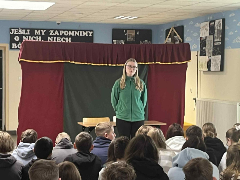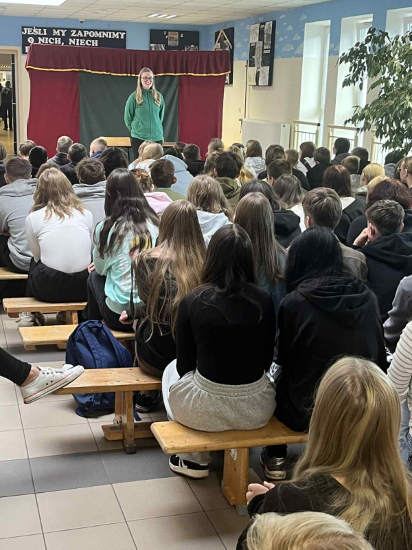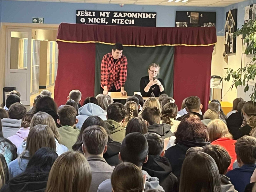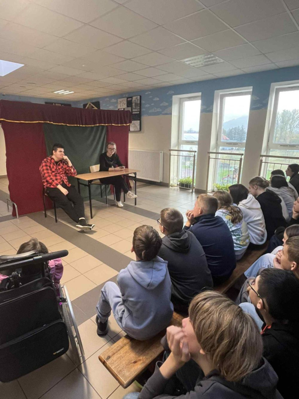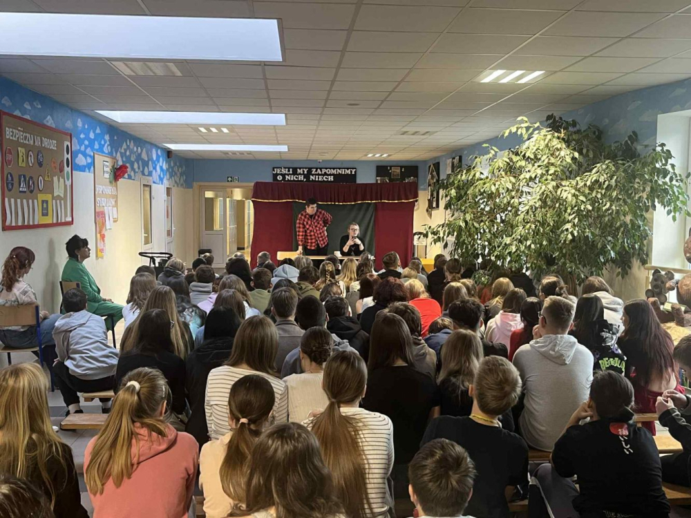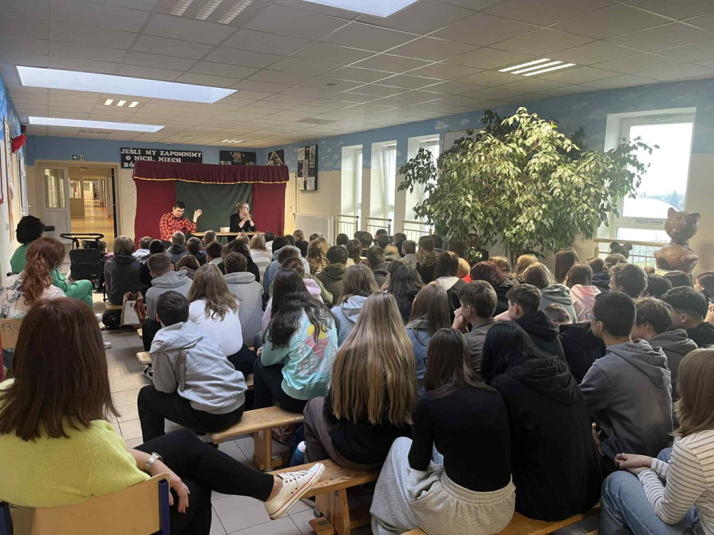 Uczniowie klas VI-VIII wzięli udział w spektaklu profilaktycznym ,,W sieci słów". Dzięki temu mogli pogłębić swoją wiedzę jak bardzo wirtualne gesty potrafią wpływać na realne życie. Jak trudno podnieść się po fali hejtu i jak łatwo przeoczyć, że ktoś obok nas przestaje się uśmiechać. To opowieść o samotności mimo zasięgów, o potrzebie prawdziwego kontaktu i o tym, że czasem jedna wiadomość może coś zmienić na lepsze lub na gorsze.