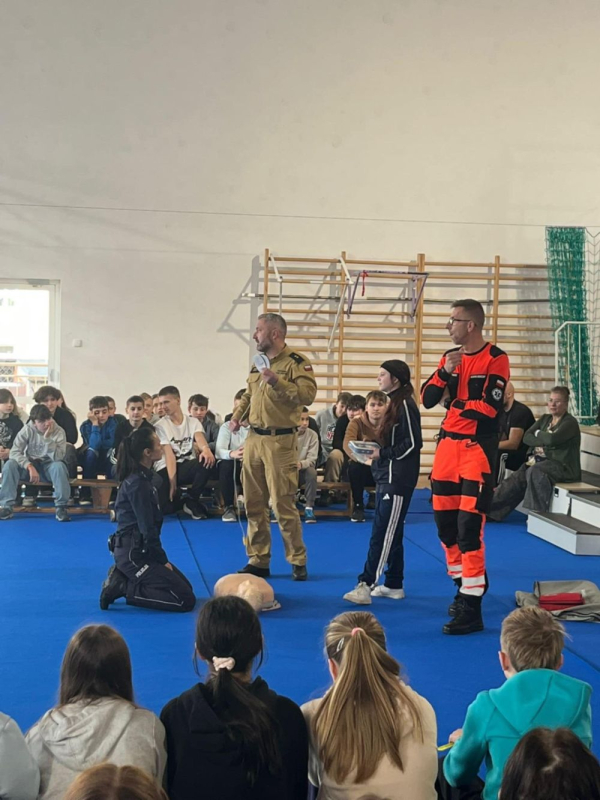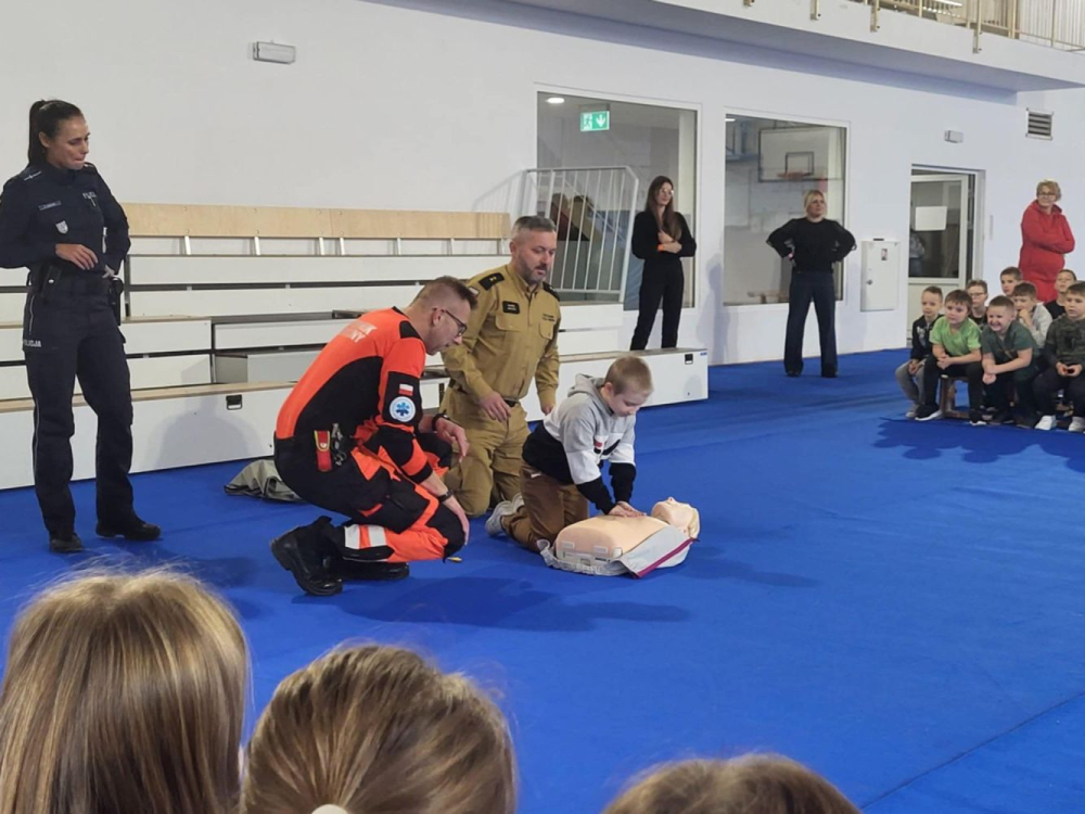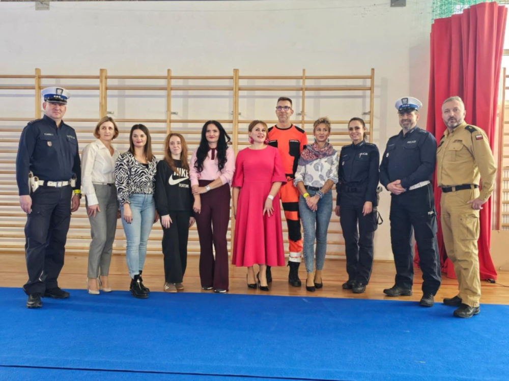 Uczniowie klas 1-8 uczestniczyli w spotkaniu z funkcjonariuszami Policji, Straży Pożarnej oraz Ratownikiem Medycznym, przypominajacym zasady bezpiecznego poruszania się po drogach i znaczenia odblasków oraz udzielania pierwszej pomocy